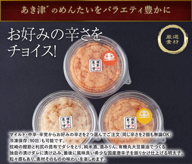 | 原材料 | すけとうだらの卵巣(米国産)、純米酒、酒みりん、醤油、鰹節、昆布、食塩、唐辛子 調味料(アミノ酸等)、酸化防止剤(V.C)、pH調整剤、トレハロース、ナイアシン、甘味料(甘草、ステビア)、発色剤(亜硝酸Na) (一部に大豆・小麦を含む) |